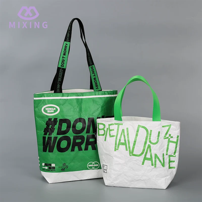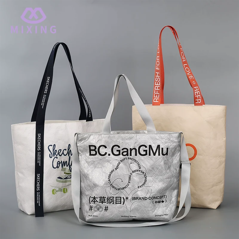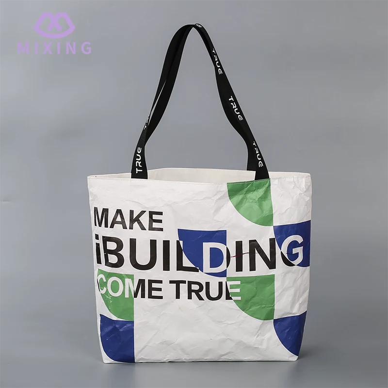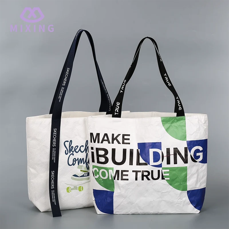 O logotipo da Mixing 's Tyvek Bags With Logo é hot stamping ou serigrafia, que pode ser escolhida de acordo com a cor, não são adesivos baratos ou jato de tinta. O logotipo hot stamping parece ligeiramente irregular quando tocado e não perde tinta quando esfregado nas roupas ou na mesa. O logotipo impresso em serigrafia tem uma cor mais brilhante e combina muito bem com a cor de fundo da bolsa. Não haverá desalinhamento ou bordas desfocadas. Mesmo que a bolsa seja de cor clara, o logotipo ainda pode ser exibido claramente e não ficará acinzentado.